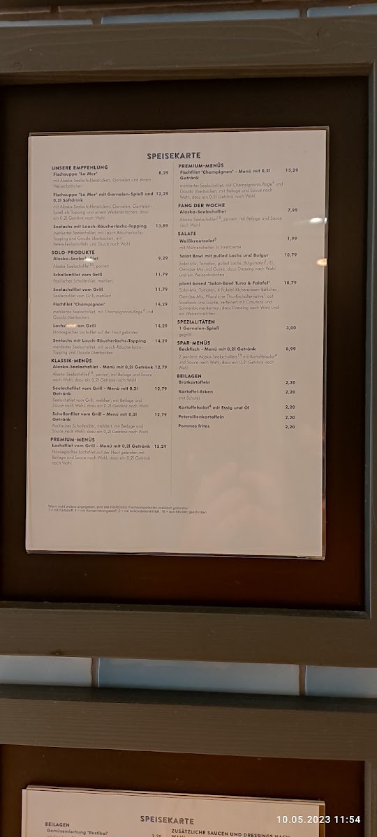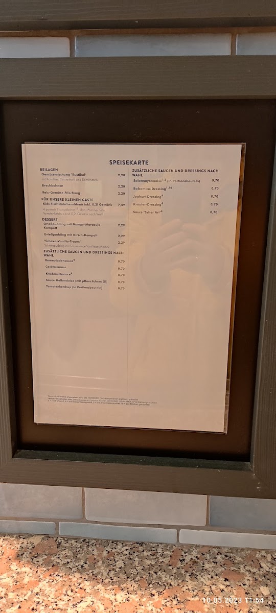 From a reviewer’s perspective, the menu at Nordsee Kaiserslautern Fackelstraße offers a well-rounded selection that highlights both classic seafood favorites and modern, plant-based options, even though specific prices are not listed. The snack section stands out with items like the Lachs Burger Deluxe, Backfisch-Baguette "Trüffel", and Küstenbackfisch-Baguette, complemented by sides such as Pommes "Trüffel" and the convenient Fish Nuggets Box. For more substantial meals, the plated dishes include hearty options like the Pazifisches Schollenfilet mit Spargelragout, XXL Alaska-Schollenfilet, and Lachsfilet auf der Haut gebraten, as well as a family-friendly Kids Happy-Fischfiguren Menü inkl. 0,2 l Getränk. The inclusion of vegetarian and vegan items such as the Vegan Tuna Fladenbrot, Plant Based-Backfisch-Ciabatta, and Vegan Räucherlaxx-Ciabatta reflects a thoughtful approach to diverse dietary preferences. Lighter choices are available in the salad section, featuring options like the Salat mit Thunfisch in Tortilla-Bowl, Salat mit Garnelen in Tortilla-Bowl, and Salat mit Pulled Lachs in Tortilla-Bowl. To round things off, simple desserts like Rote Grütze mit Vanillasoße and Schokopudding mit Vanillasoße pair well with a standard range of beverages including Coca-Cola Classic, Coca-Cola Zero, and Vio Mineralwasser Medium. Overall, the menu provides a satisfying mix of traditional seafood dishes and contemporary alternatives, making it appealing to a broad audience despite the absence of clearly stated prices.